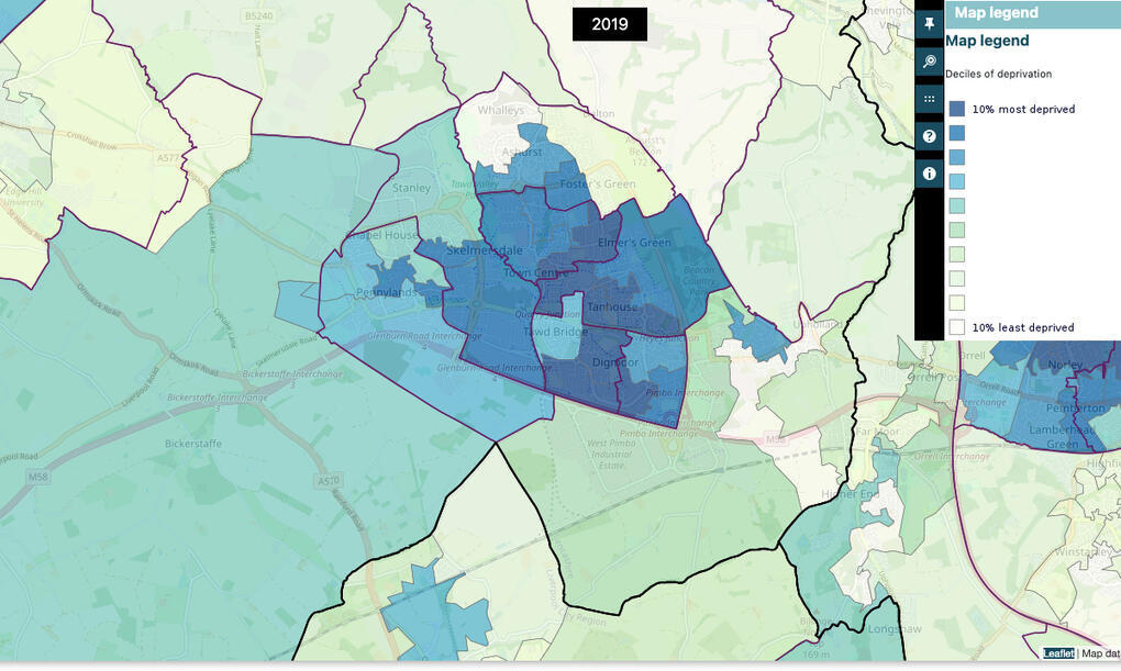 About the surveyI am completing coursework for my A level geography course at Winstanley College under the title "To what extent do socioeconomic factors influence the perception of and response to climate change?".The investigation aims to further examine the conclusion reached by Lübke (2020) who suggested that, due to various factors such as perceived or real threats to economic security due to wide-ranging societal and economic reform necessary to mitigate the worst impacts of climate change as well as economic dependence on fossil fuels, there is a correlation between climate change denial and disbelief and economic prosperity of a particular region.To this end, I will be examining differing attitudes towards climate change and the different responses thereto in areas with differing levels of socioeconomic deprivation. I will be collecting primary data from Skelmersdale, West Lancashire, which is in the 20% most deprived areas in England on the Department for Levelling Up, Communities and Local Government's Indices of Multiple Deprivation (IMD), although displays a stark disparity between LSOAs within the town. The map below illustrates this contrast: